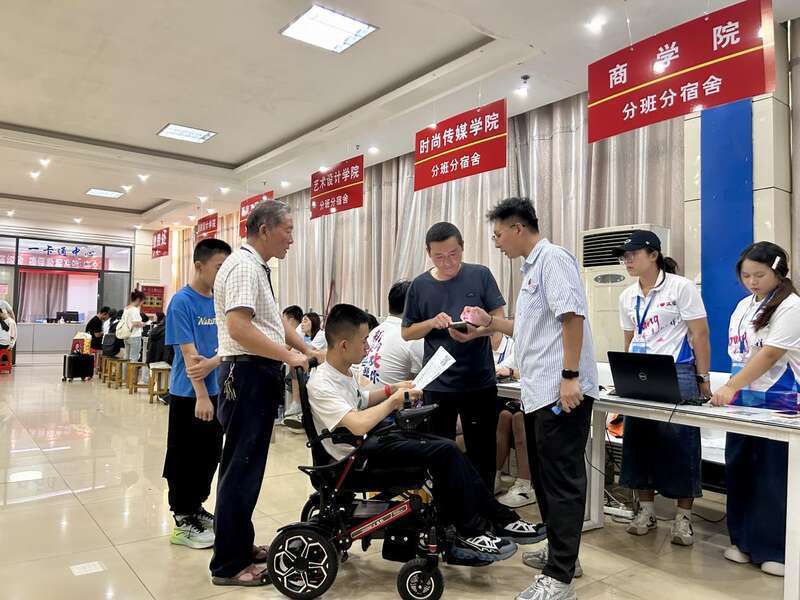 在老师和家长陪同下,童达内“驾驶”他的电动轮椅,办理新生报到手续。童国东说,“学校帮忙配齐了我们能想到的所需物品。非常感谢学校的关心和帮助!”