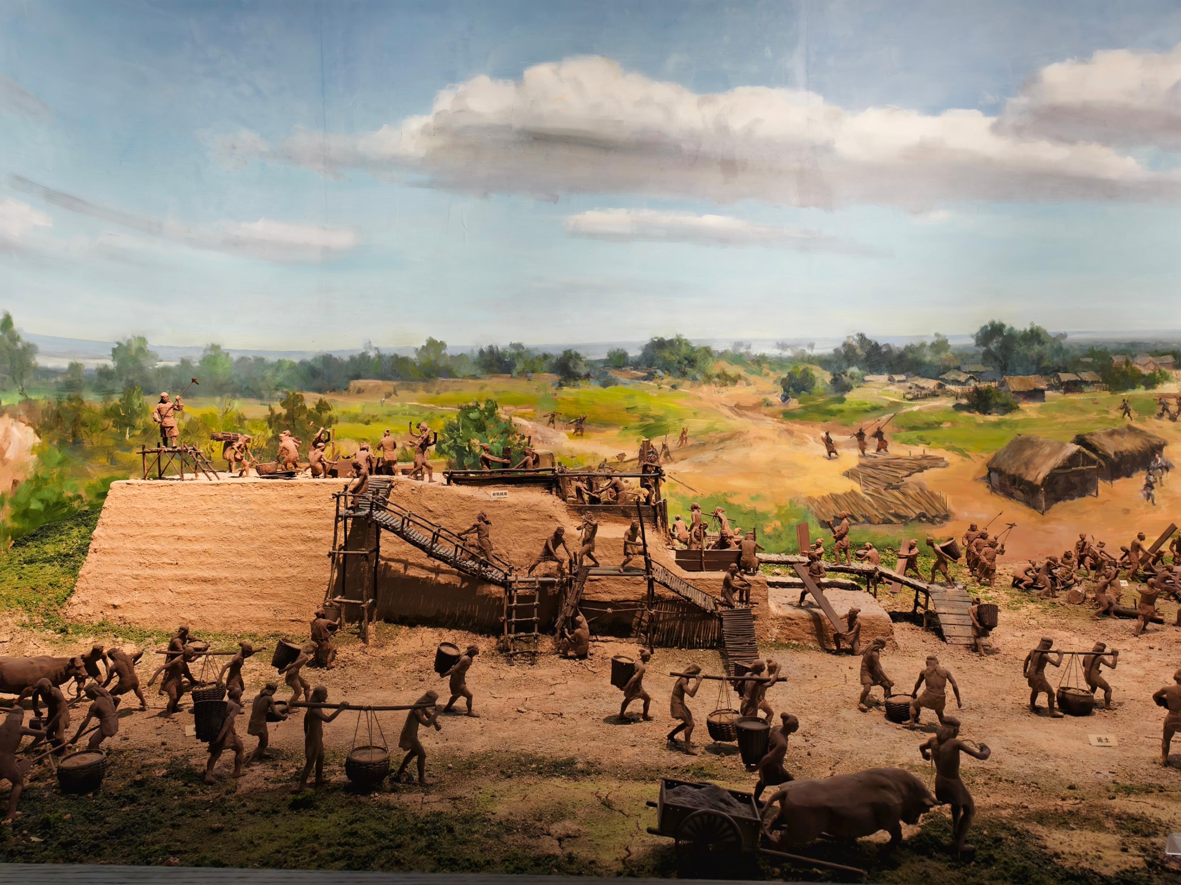 郑州商都遗址博物院内呈现的筑造城墙图。